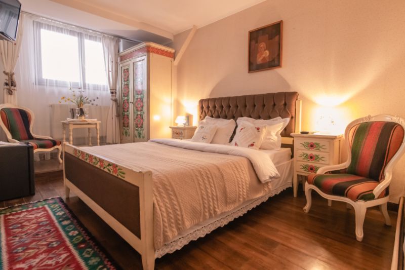 Cameră dublă sau twin spațioasă (15 m²), ideală pentru cupluri sau prieteni, cu posibilitatea de alegere între pat dublu sau 2 paturi separate. Camerele păstrează elemente tradiționale autentice, specifice Hanului Ancuței.