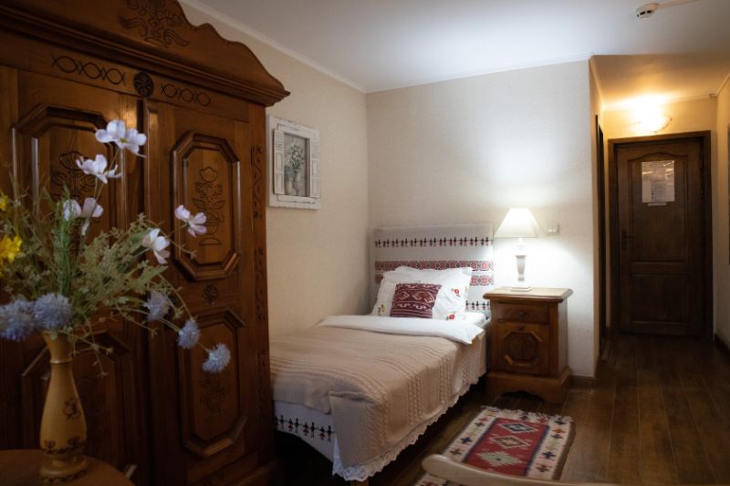Cameră single confortabilă, cu o suprafață de 15 m², ideală pentru o persoană. Decorul păstrează stilul tradițional al hanului, oferind un ambient relaxant și primitor.